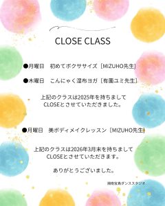 ※天候や災害、交通事情や、講師の体調不良などにより、やむを得ず当日の対応を取らせて頂く場合もございます。InstagramやHPにてなるべく皆様へ、早い情報発信を心掛けますが、スタジオにお越しになる前に改めて各SNSをご確認下さいますよう宜しくお願い致します。